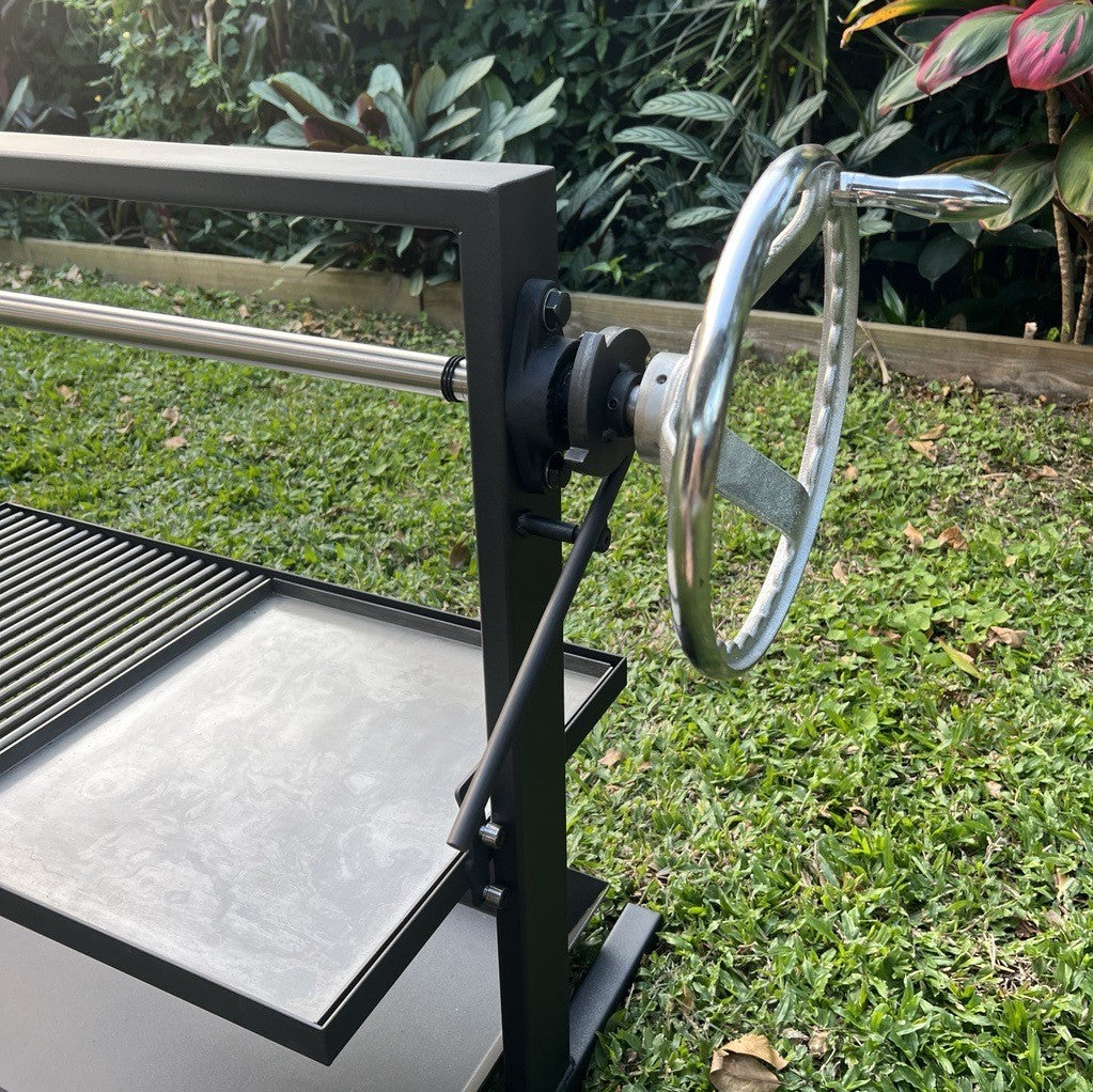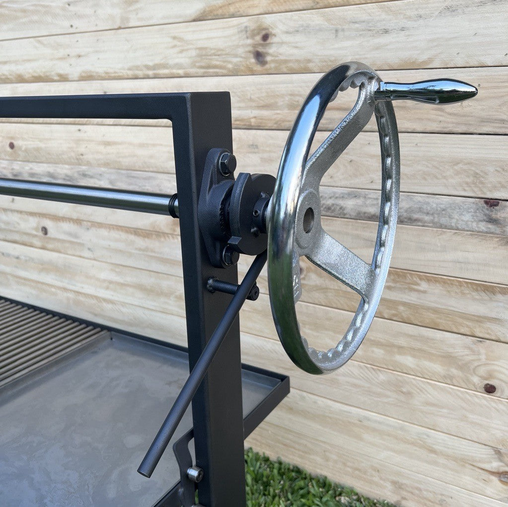 The solid cast handwheel with rotating speed handle makes for easy grill height adjustment.