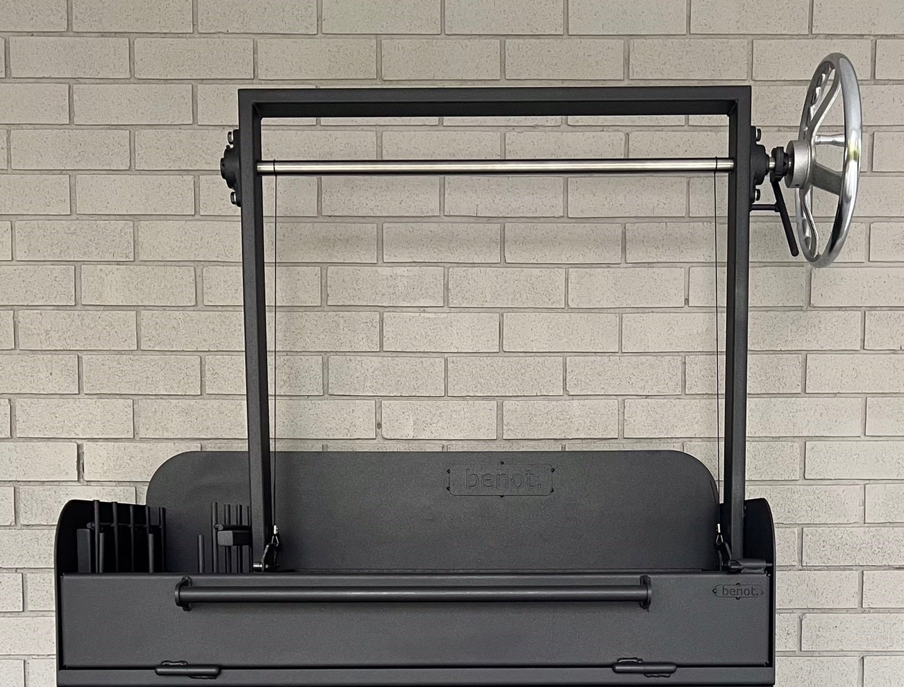 The solid cast handwheel with rotating speed handle makes for easy grill height adjustment.